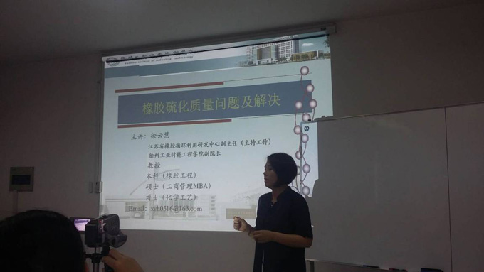 今回の研修は徐工院工程学院の副院長の徐雲慧教授をはじめとして、全部で8名のベテラン教師がチームを構成しています。その中の教授は1人で、助教授は4人で、博士は1人で、高工は1人で、講師は1人で、いずれもこの学校の学科の指導者と基幹教師です。トレーニングコースは生ゴムと合剤、ゴムの調合設計技術、ゴム加工設備と金型、ゴム加工技術とテスト技術などの面に関連して、全部で三日間です。