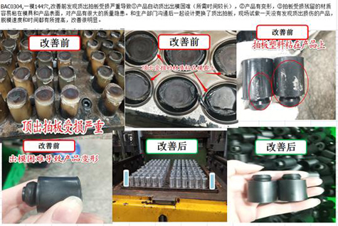 金型突き出し板の改善提案を実現し、型抜き変形を効果的に低減しました。