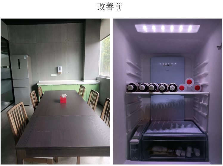 当日、上の階の下を一周してみると、冷蔵庫は管理の死角と言えることが分かった。中には何でもあり、何巻かのゴム材料もあった。そして冷蔵庫管理からオフィスビルの改善が一歩ずつ始まり、指摘が続く中で、きれいに掃除していないから死角管理というわけではないことを徐々に実感してきましたが、実は整理・整頓から始まり、不要なものはどんなにきれいに掃除しても、並べて整頓しても、管理の死角です。