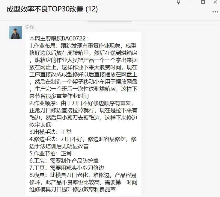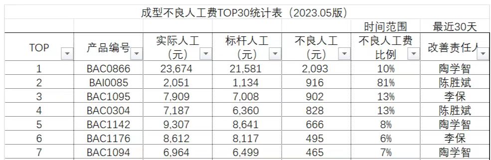 我々はそれぞれ作業配置、作業手順、型出し手法、トリミング手法、作業タクト、治具、金型など8つの方面から浪費の識別と分析を行い、成形効率不良top 30の報告改善メカニズムを制定した。