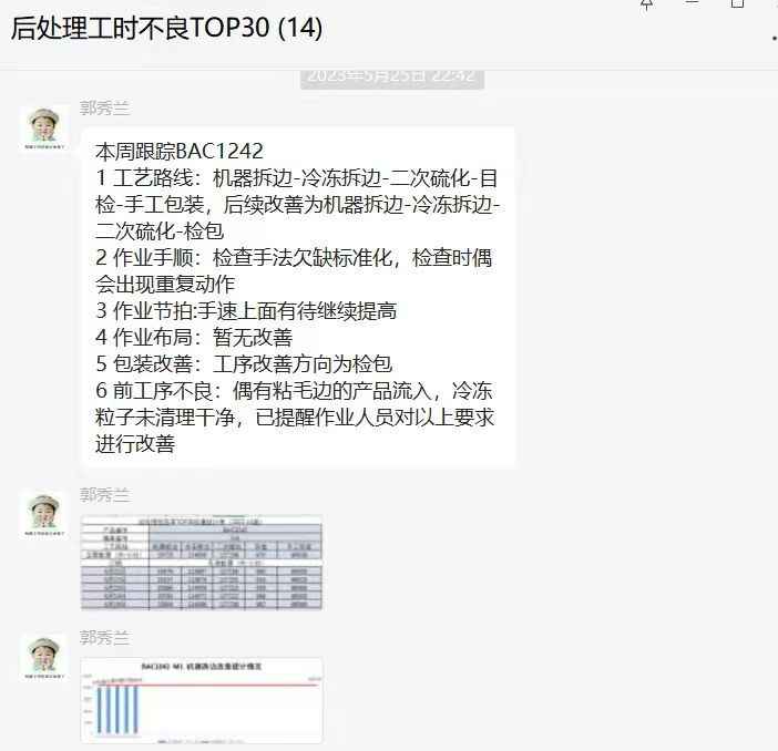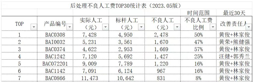 我々はそれぞれ工順、作業手順、作業タクト、作業レイアウト、包装改善と前工程不良などの6つの方面から分析を展開し、後処理工数不良top 30の報告改善メカニズムを制定した。
