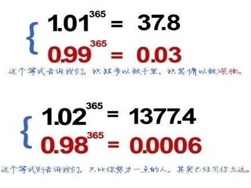 公式中的365次方代表一年的365天,1代表每一天的努力,1.01表示每天多做0.1,0.99代表每天少做0.1,365天后,一个增长到了37.8,一个减少到0.03。它告诉我们:在人生的路程,每天多做一点点,积少成多,就会带来巨大的飞跃。