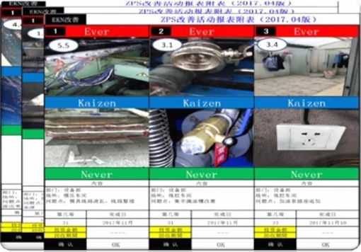 丰田老师针对正村公司的实际情况,主要从两个方面进行开展:一是对公司人员进行丰田TPS精益生产方式的理论培训,主要从几方面的意识进行了加强,比如消除生产过程中的七大浪费,现地现物的习惯以及持续改善的决心;二是运用改善的方法进行工作,首先对实际工作中的问题进行头脑风暴,根据头脑风暴形成亲和图,各部门从亲和图进行改善计划,计划达成后形成改善活动汇总表进行汇报,同时在日常工作中形成每日进步一点点的看板,大家对自己日常工作和管理中的不足内容进行收集,并进行每日的改善,改善后形成EKN(Ever-Kaizen-Never)报告。